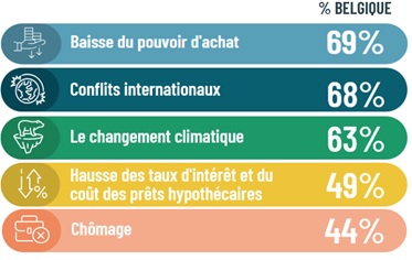 Il convient de souligner qu’outre les ‘grands’ thèmes tels que les conflits internationaux et le changement climatique, la situation (financière) personnelle est une source d’inquiétude. Pour 1 Belge sur 5, la baisse du pouvoir d’achat est même une source d’inquiétude ‘très importante’.
