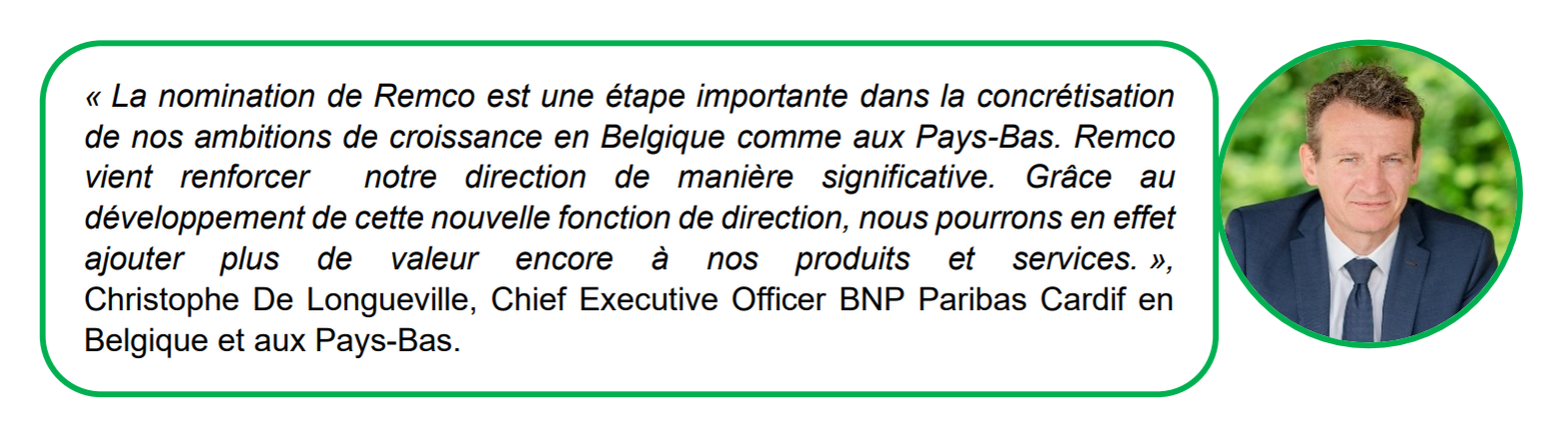 BNP Paribas Cardif, leader mondial de la protection des crédits et spécialiste en partenariats, annonce la nomination de Remco Hoogweg au poste de Chief Value Proposition Officer. Remco Hoogweg est responsable du développement et de l’optimisation des produits et des services ainsi que de la stratégie marketing et RSE en Belgique et aux Pays-Bas. Il dirige les départements Digital, Product Management, Partnerships, B2C Sales, Marketing, Communication et CSR.